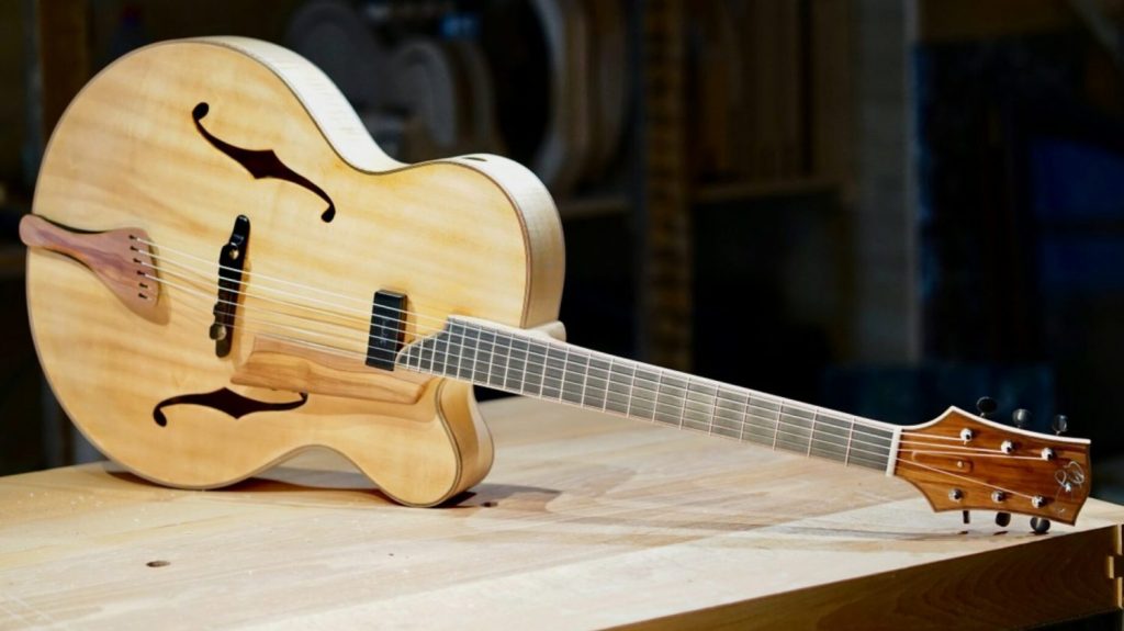Une modèle de guitare dessiné par mes soins, une OM avec un volume de caisse plus important, pour un instrument versatile : à l’aise aux doigts comme en rythmique.