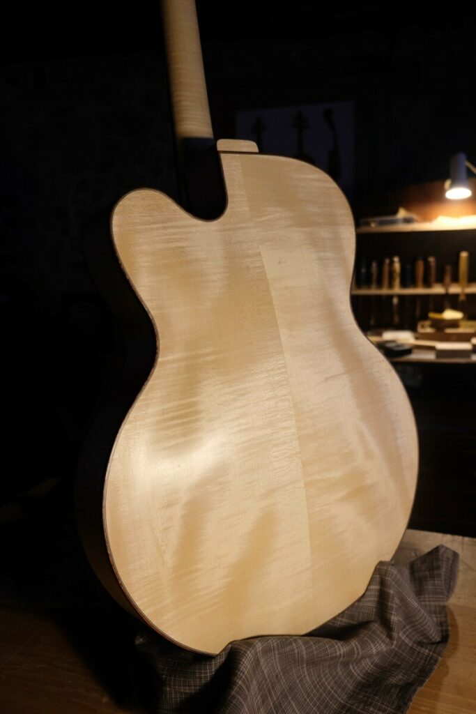 Guitare conçue et fabriquée dans mon atelier à Egletons (Corrèze, France) avec des bois et matériaux soigneusement sélectionnés.