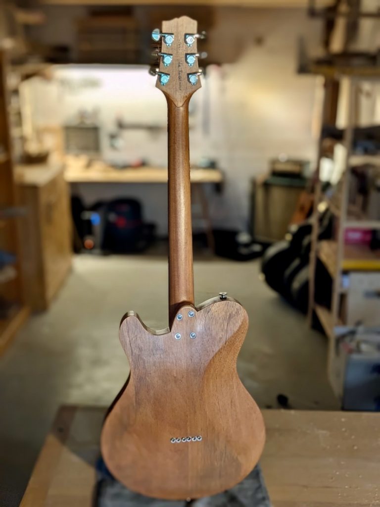 Une guitare entièrement conçue et fabriquée dans mon atelier à Egletons (Corrèze, France) avec des bois et matériaux soigneusement sélectionnés.